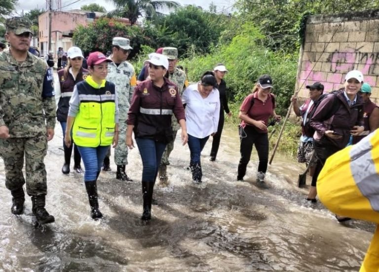 CHETUMAL.- La gobernadora Mara Lezama Espinosa recorrió diversos puntos de la ciudad de Chetumal que fueron afectados por las fuertes lluvias que dejó a su paso la tormenta tropical Sara.