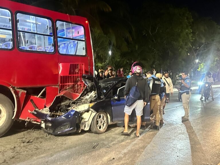 CANCÚN.- Una persona fue rescatada de los fierros retorcidos la noche del 31 de diciembre, luego de impactarse, a bordo de un auto particular, contra un camión de transporte público en la Zona Hotelera de esta ciudad.