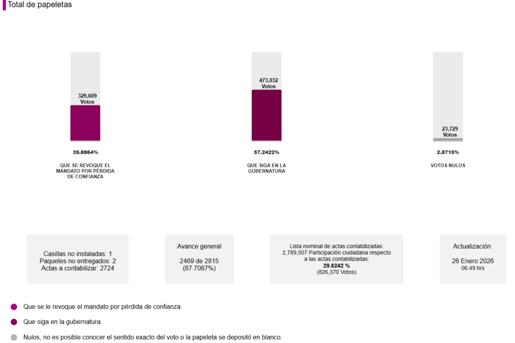 De acuerdo con el Instituto Estatal Electoral y de Participación Ciudadana de Oaxaca (IEEPCO), aunque los cómputos distritales continuaban, se confirmó desde el cierre de la jornada que no se alcanzó el umbral requerido, por lo que el gobernador permanecerá en funciones independientemente del sentido mayoritario del voto.