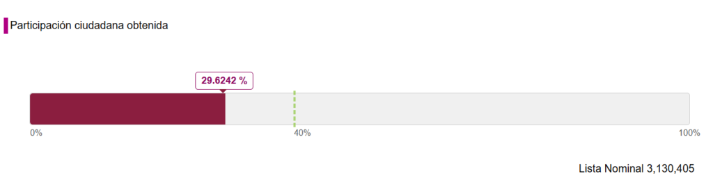 Hasta el último corte público del IEEPCO, con alrededor de 7% de casillas computadas, el resultado parcial mostraba aproximadamente 60 % a favor de que continúe el gobernador y 38 % por la revocación, con una participación por debajo del umbral legal establecido.