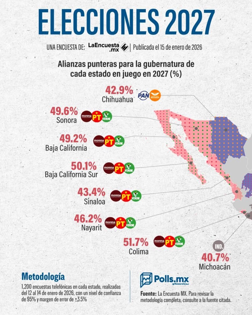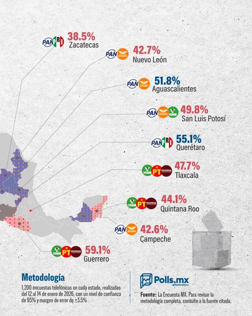 De estos 10 estados, donde Morena (con aliados) está mejor posicionada, encabeza Guerrero con 59.1; seguido de Colima con 51.7; Baja California Sur con 50.1; Sonora con 49.6; Baja California con 49.2; Tlaxcala con 47.7 y Nayarit con 46.2.