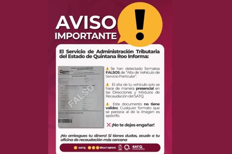 CHETUMAL.- El Servicio de Administración Tributaria del Estado de Quintana Roo (SATQ) emitió una alerta preventiva a la ciudadanía luego de confirmar la circulación de un formato apócrifo denominado “Alta de Vehículo de Servicio Particular”, el cual es totalmente falso y no corresponde a ningún trámite oficial de la dependencia.