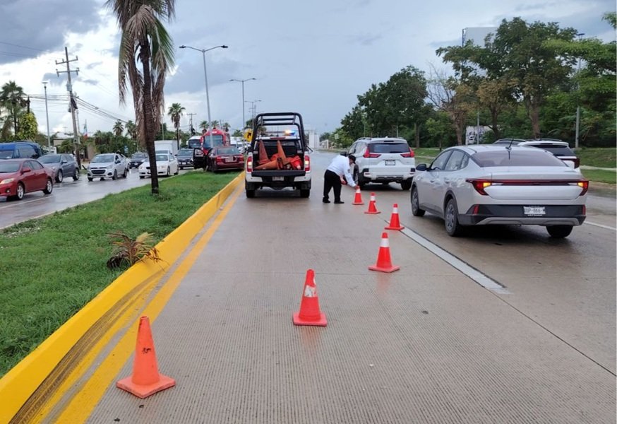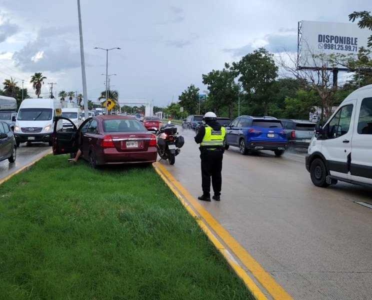 El percance se registró alrededor del mediodía, cuando el conductor de un auto de la marca Chevrolet, tipo Aveo, color rojo vino, que circulaba en dirección hacia Cancún, no tomó en cuenta las condiciones de la vía que se encontraba mojada, lo que ocasionó que derrapara y saliera de su carril.