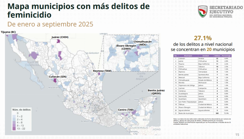 Estos 20 municipios concentran el 27.1 % de los feminicidios del país.