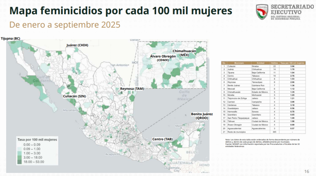 De acuerdo con el informe, 27.1 por ciento de los feminicidios ocurridos en México se concentran en apenas 20 municipios, lo que revela una alta concentración territorial de la violencia contra las mujeres. Dentro de esa lista, Benito Juárez (Q. R.) destaca como el único municipio de toda la Península de Yucatán incluido en el mapa nacional de alerta por feminicidios.