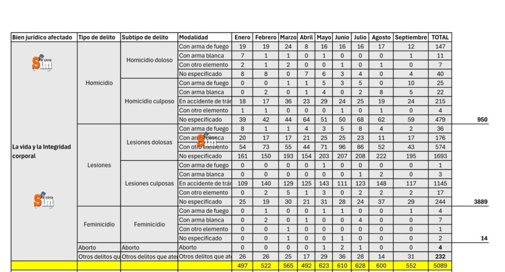 El delito que incrementó fue el de lesiones, pues en 2024 de enero a septiembre el reporte fue de 3 mil 709 y para el mismo periodo del 2025 el reporte es de 3 mil 889 casos, 180 incidentes menos; el crecimiento fue de 4.62 por ciento. Otro caso de aumento fue el de feminicidios, en el periodo que se informa en 2024 la cifra llegó a ocho, mientras que en 2025 es de 14, en cuestiones porcentuales el incremento fue de 42.85.