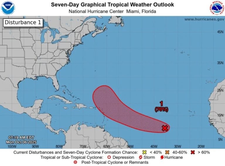 MIAMI.– Una amplia zona de baja presión asociada con una onda tropical de baja latitud continúa generando una extensa área de lluvias y tormentas eléctricas desorganizadas sobre el Atlántico tropical central, informó el Centro Nacional de Huracanes (NHC).