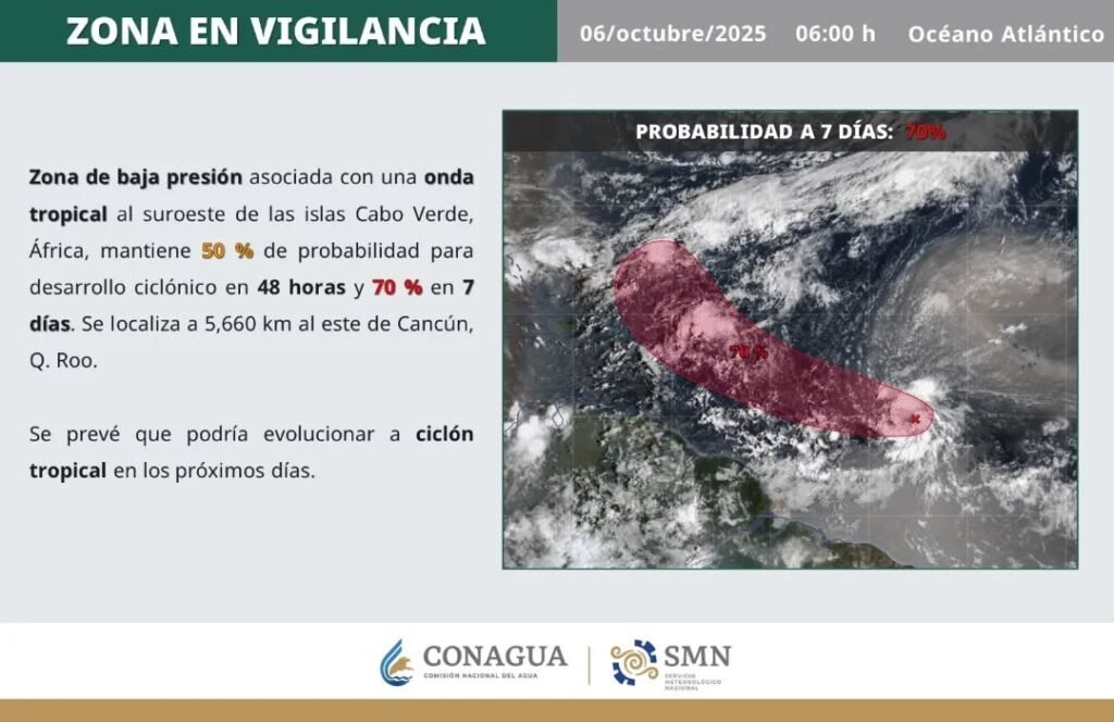 De acuerdo con el reporte, la onda AL95 se desplaza a través del Atlántico tropical central y podría acercarse a las Islas de Sotavento del norte hacia finales de la semana.