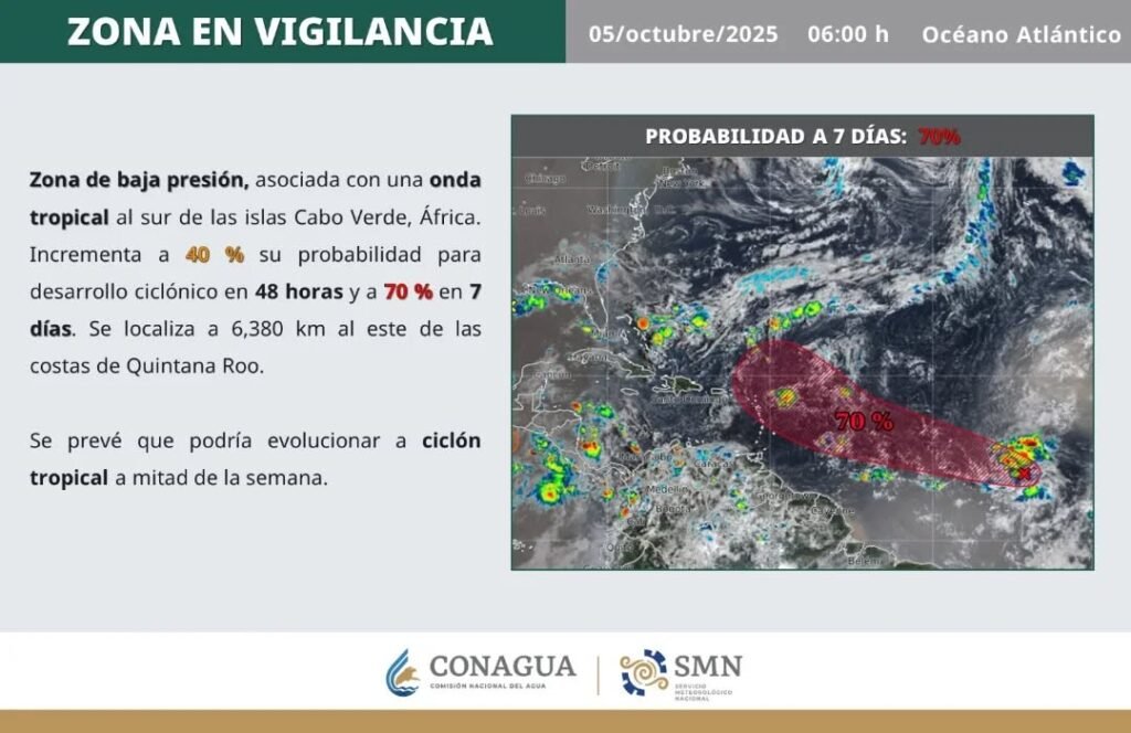 El NHC asignó al sistema una probabilidad de formación del 40 por ciento en 48 horas y una probabilidad alta del 70 por ciento en siete días.