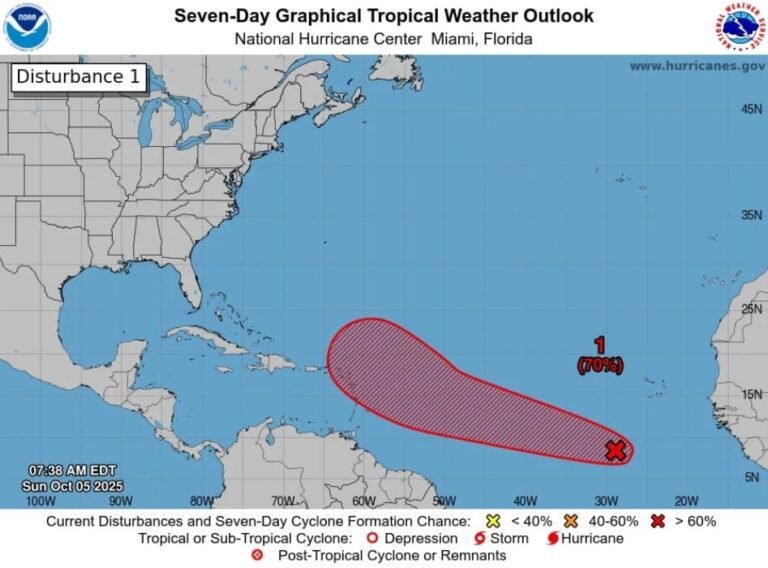 El NHC asignó al sistema una probabilidad de formación del 40 por ciento en 48 horas y una probabilidad alta del 70 por ciento en siete días.