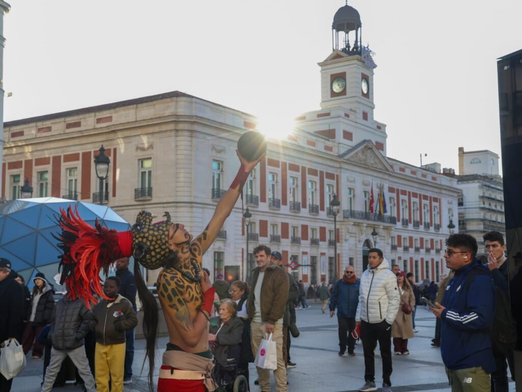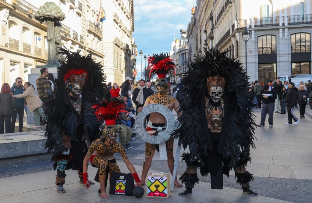 Plumas, sobre todo plumas, pintados sus cuerpos como si fueran calaveras a lo James Bond en México, o como si estos “mayas galácticos” que llevó el gobierno de Quintana Roo a la Fitur 2026 se tratara de un remedo aplumado de Toro, el buen salvaje compañero del Llanero solitario que encarnó Jonny Depp en una película de 2013. Plumas y más plumas, y una serie de vistosos trajes que una vez recuerdan a los concheros que danzan en el zócalo o en la basílica de Guadalupe, y otras a falsos dioses calaveras adoradores de la santa muerte, garbosos en su plumerío imitando no a faisanes o pavos de monte, sino a puercoespines psicodélicos.