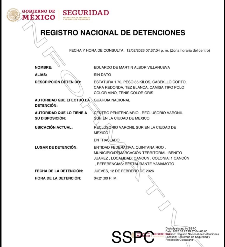 El aseguramiento ocurrió este jueves en la supermanzana 3, frente al restaurante Yamamoto, donde agentes federales le notificaron la existencia de un mandamiento judicial en su contra, de acuerdo con datos del registro de detenciones de la Secretaría de Seguridad y Protección Ciudadana.