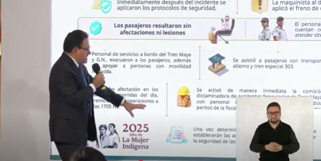 CIUDAD DE MÉXICO.- En una participación al inicio de La Mañanera del Pueblo, con la presencia de la presidenta Claudia Sheinbaum, el director general del Tren Maya, General David Lozano Águila, explicó que se activaron los motores de la aguja del cambio de vía durante el paso del tren, lo que ocasionó que el segundo vagón se descarrilara, sin ocasionar personas heridas.
