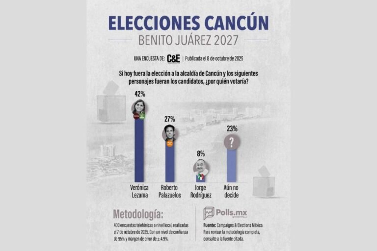 Pools Mx retomó ayer una encuesta de C&E Research sobre las preferencias en Cancún. En ese estudio, Verónica Lezama aparece con 42 % de intención de voto, arriba, pero todavía por debajo de la mayoría absoluta del 50 + 1.