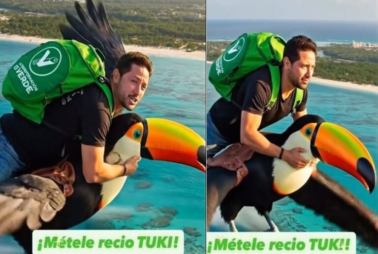 En el video de IA, se observa una imagen que se parece al diputado cozumeleño y está montado sobre tucán que vuela a gran altura.
