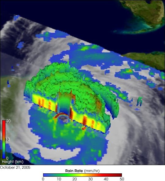 El satélite de la Misión de Medición de Lluvias Tropicales (TRMM) captó a Wilma acercándose a la Península de Yucatán a las 00:55 UTC del 21 de octubre (20:55 EDT del 20 de octubre). La imagen tridimensional obtenida mostró un ojo perfectamente definido, con nubes que se elevaban más de 10 kilómetros sobre el océano.