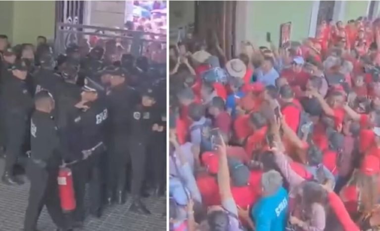 Los policías estatales que resguardan la puerta principal los repelieron y, ante el número mayor que presionaba, arrojaron producto tóxico, al parecer lacrimógeno.