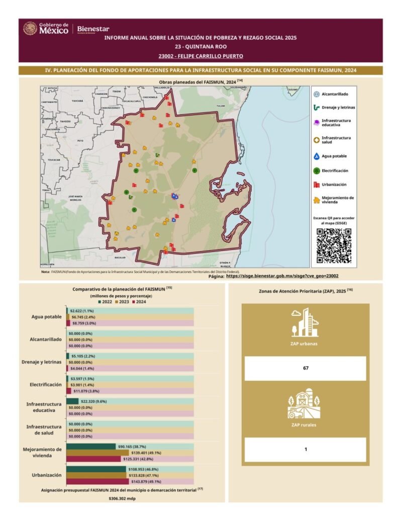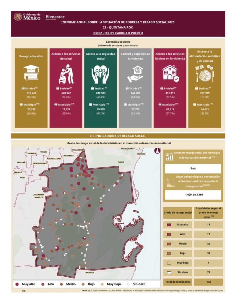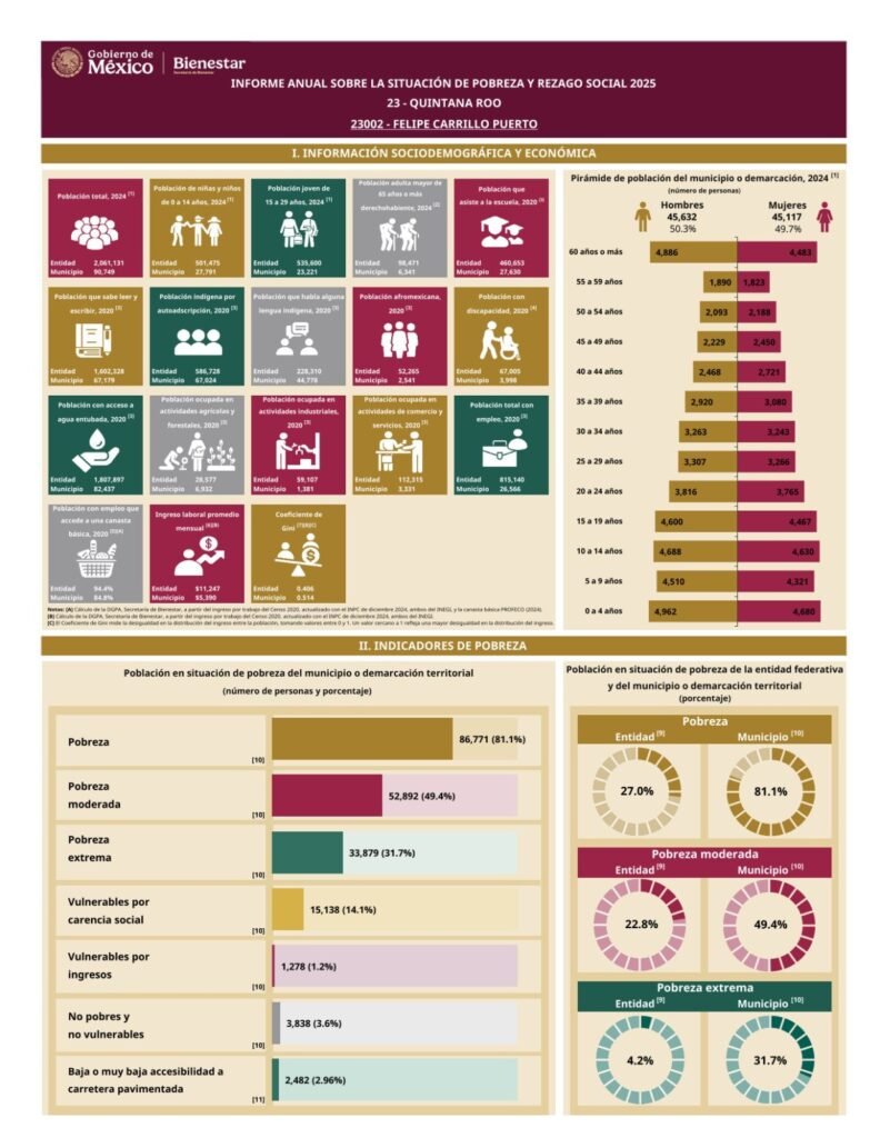 Felipe Carrillo Puerto.- Felipe Carrillo Puerto, municipio gobernado por María Candelaria Hernández Solis, incrementó su pobreza multidimensional al pasar de 80.1% en 2024 al 81.1% en 2025, de acuerdo con el Informe Anual de la Secretaría del Bienestar (Sebien) del Gobierno de México.